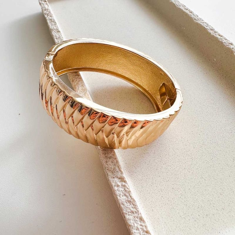 Disponível nas cores dourado e prateado, é uma bijuteria moderna que combina impacto visual e conforto. O fechamento articulado facilita o uso, garantindo praticidade e encaixe perfeito.