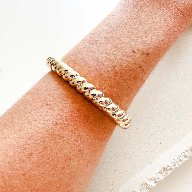 Seu design é composto por pequenos gomos arredondados contínuos que criam textura, volume e movimento na peça. O resultado é um bracelete marcante, contemporâneo e cheio de personalidade.