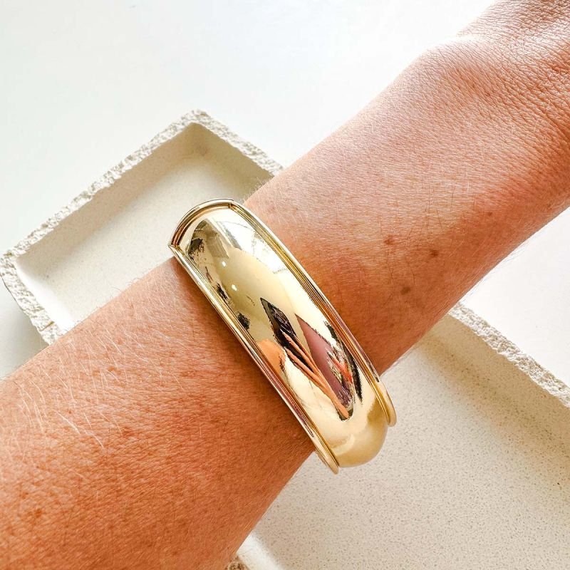 Com design liso, volumoso e levemente elevado no centro, ele cria um efeito elegante e poderoso no pulso. O detalhe de friso nas laterais adiciona acabamento refinado e valoriza ainda mais o desenho da peça.