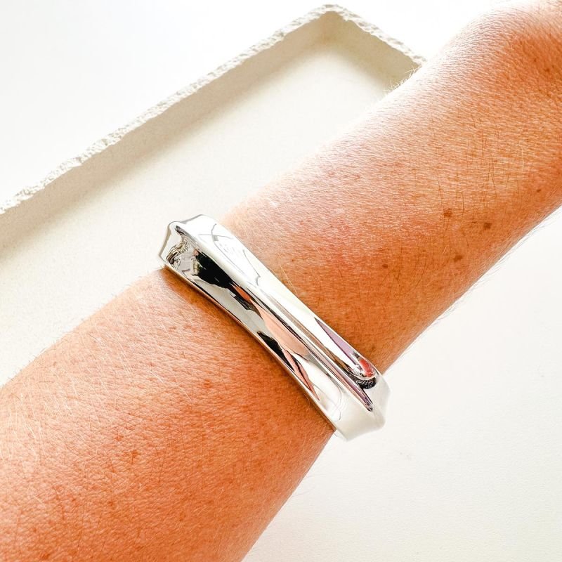 Com design minimalista e estrutura larga, esse bracelete entrega impacto imediato. O formato levemente orgânico e arredondado traz modernidade e sofisticação, inspirado nas tendências contemporâneas de acessórios statement.