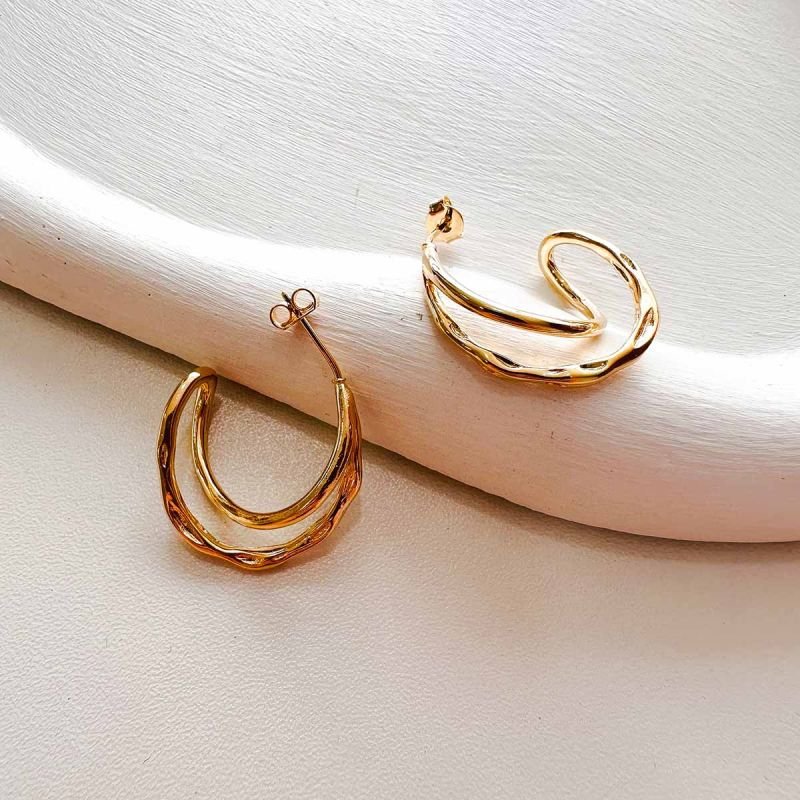 Design: argola com inspiração natural em troncos, com curvas e relevos orgânicos.
