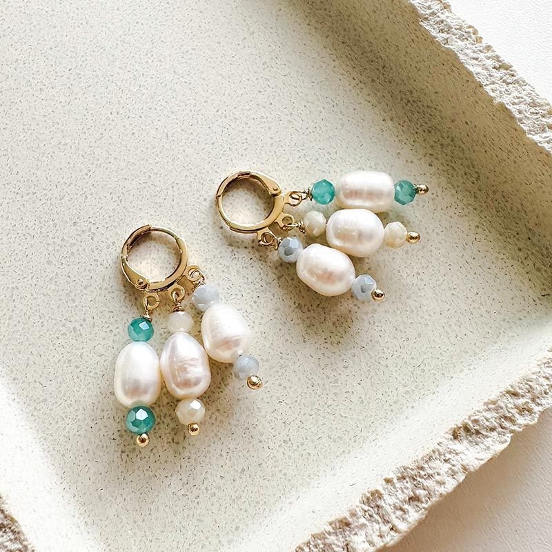 Delicado, elegante e cheio de movimento, o brinco argolinha banhado a ouro 18k com pérolas de água doce e cristais é uma joia que une o clássico ao contemporâneo. As pérolas naturais, com seus formatos orgânicos e brilho suave, tornam cada par único, enquanto os cristais em tons claros e verde água adicionam frescor e leveza à composição.