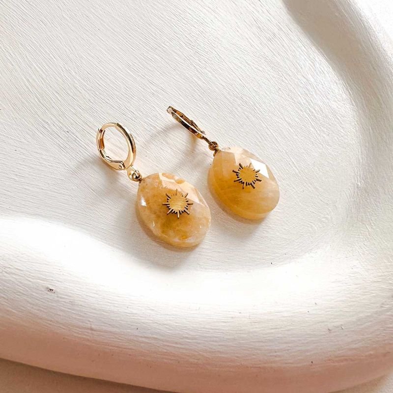Delicado e cheio de personalidade, esse brinco com base de argolinha traz um pingente de pedra citrino natural em formato oval, com aplicação de um sol dourado gravado no centro o símbolo de luz, energia e renovação. A base é banhada a ouro 18k, com fecho de clique confortável e seguro.
