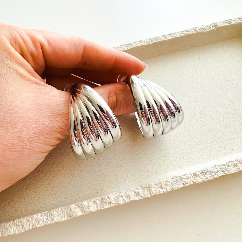 O brinco argola escultural texturizada é uma bijuteria marcante, com design curvado e linhas paralelas que criam movimento e profundidade.