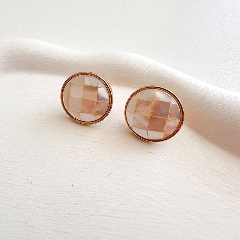 Este brinco apresenta uma base redonda dourada com aplicação de madrepérola trabalhada em mosaico geométrico. Cada pequena placa possui um brilho iridescente único, variando entre tons perolados, rosados e champagne.