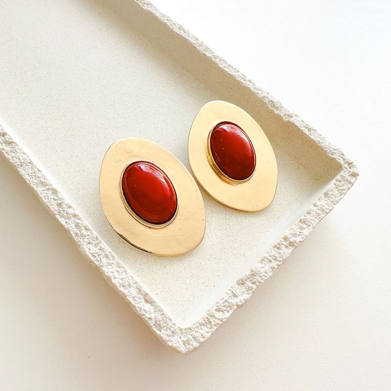 O Brinco Bijuteria Oval com Pedra de Resina é uma bijuteria sofisticada, com inspiração retrô e presença marcante. A base metálica dourada em formato orgânico envolve uma pedra resinada central, criando contraste e destaque no rosto.