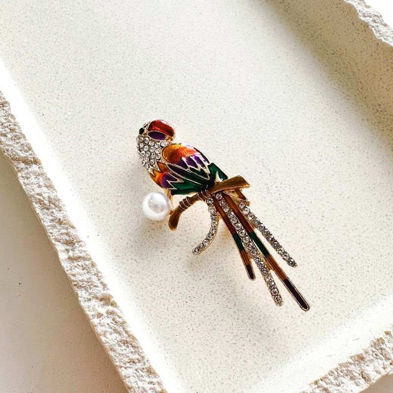 Broche Bijuteria Arara Tropical com Pérola e Strass