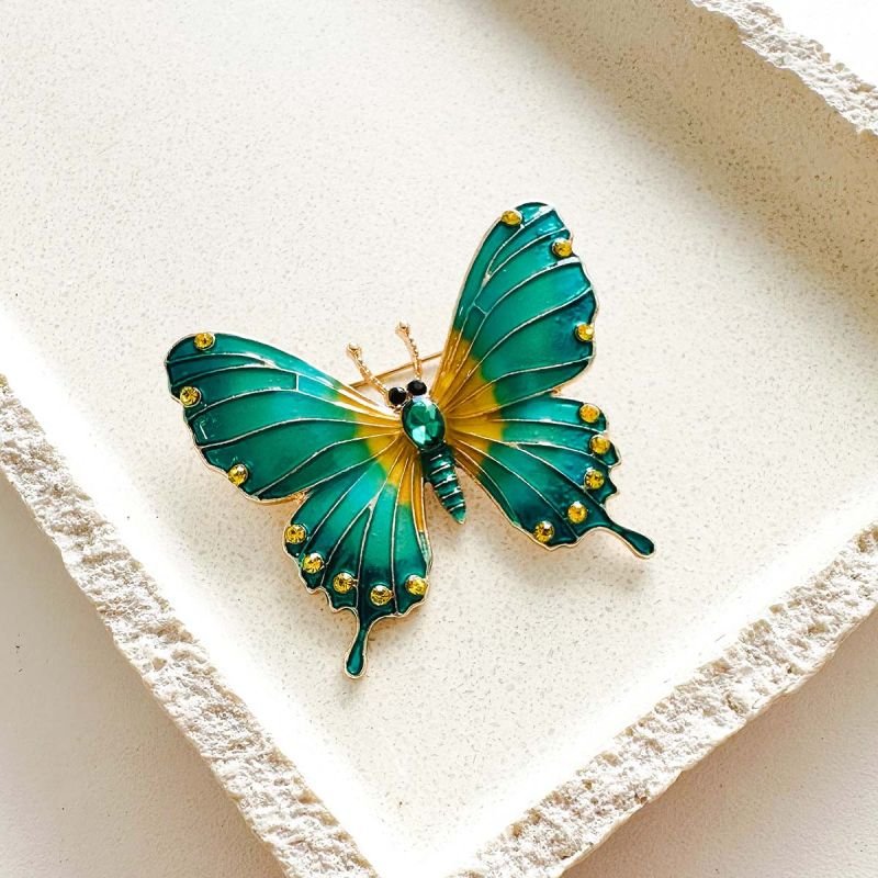 Elegante e cheio de significado, o Broche Bijuteria Borboleta Verde Água com Strass é um acessório que traduz delicadeza e personalidade em um único detalhe. Inspirado na beleza das borboletas, símbolo de transformação e renovação, este broche apresenta um design sofisticado com asas amplas esmaltadas em tom verde água vibrante e nuances douradas que criam um efeito visual encantador.