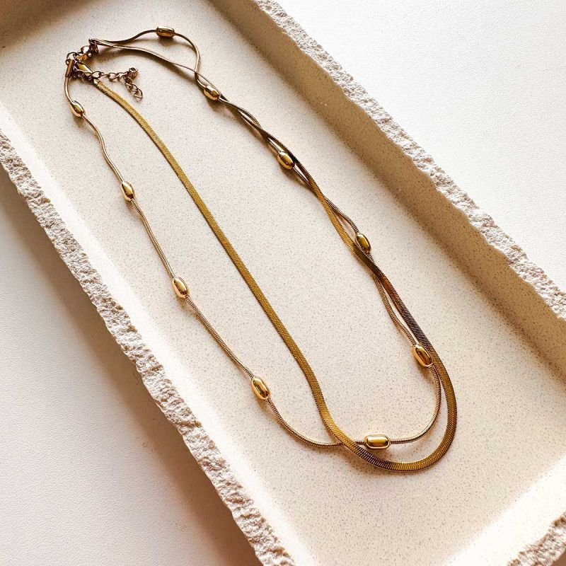 O caimento duplo cria camadas naturais que valorizam o colo e iluminam o visual. A fita mais larga fica levemente mais curta, enquanto a corrente com bolinhas acompanha a linha do pescoço com um toque de movimento.