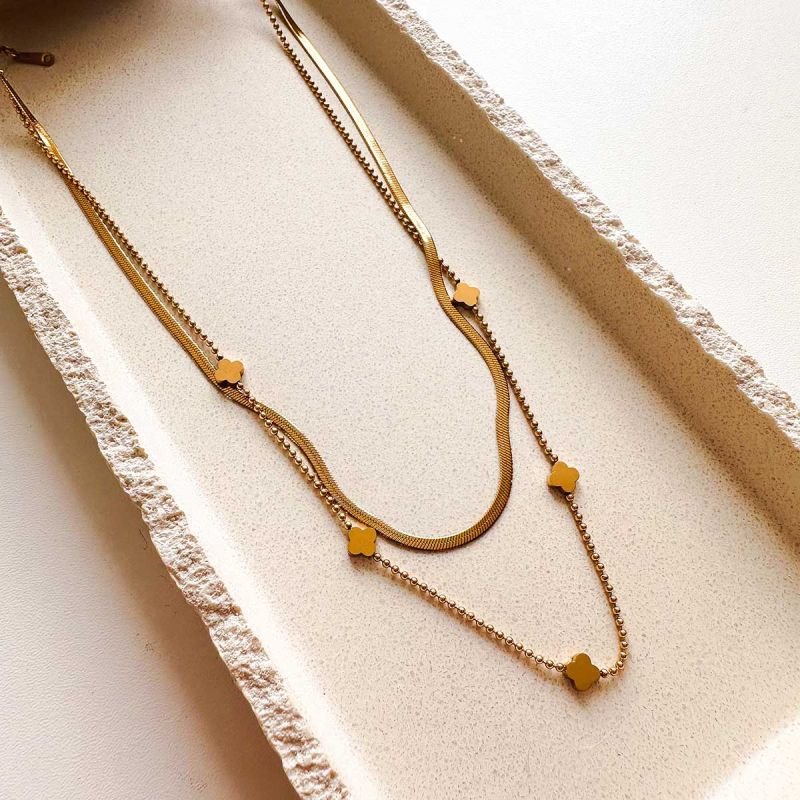 O Colar Aço Dourado Duplo Fita e Trevo é aquele mix pronto que levanta qualquer look. Composto por duas correntes em aço inox — uma estilo fita/snake super sofisticada e outra com esferas polidas e pequenos trevos lisos — ele entrega modernidade, brilho e simbolismo em uma única peça.