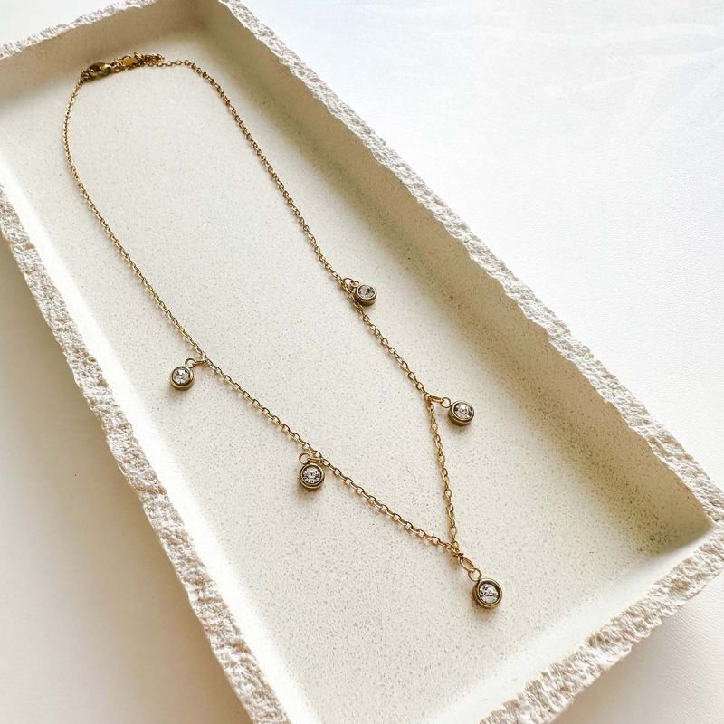 Minimalista, delicado e sofisticado, o colar de aço dourado com pingentes de Strass é a peça ideal para quem ama brilho na medida certa. Seu design em corrente fina com pontos de luz estrategicamente distribuídos cria um efeito elegante e moderno no colo, perfeito para iluminar qualquer produção.