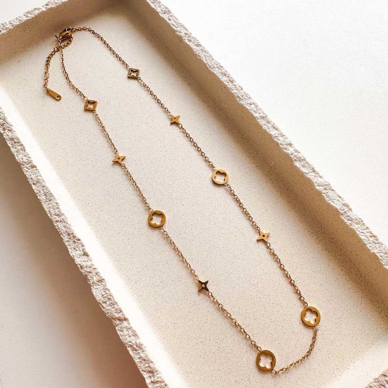 O Colar Aço Dourado Trevo Vazado é uma peça charmosa, moderna e cheia de delicadeza. Com uma corrente leve e elegante, ele traz pequenos pingentes em formato de trevo vazado alternados com estrelas estilizadas, criando um design fluido, sofisticado e super atual.