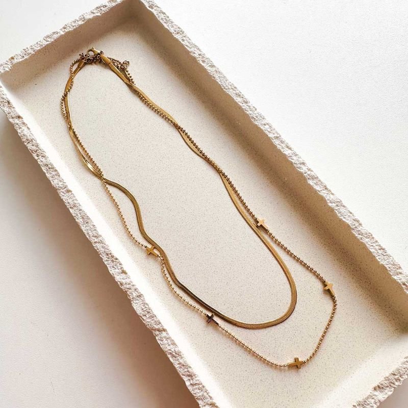 O colar forma duas camadas que se acomodam perfeitamente no colo. A fita traz um caimento mais reto e sofisticado, enquanto a corrente com cruzes cria movimento leve e um toque de delicadeza com personalidade.