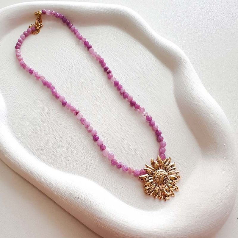 Um colar que combina o poder das pedras naturais com a energia vibrante do girassol, símbolo de alegria, vitalidade e luz. O fio de jade facetada traz cor e elegância, enquanto o pingente de girassol banhado a ouro 18k transforma a peça em um amuleto cheio de significado.