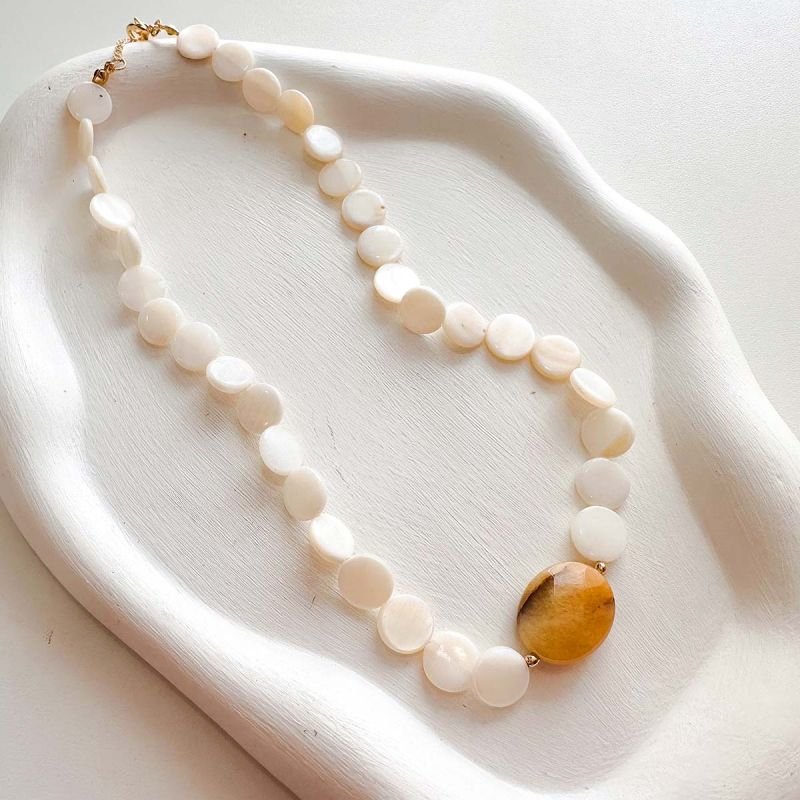 Este colar une a suavidade da madrepérola em formato disco ao charme natural da pedra calcita, criando uma peça sofisticada e cheia de significado. O banho em ouro 18k nos metais traz brilho, resistência e acabamento refinado, valorizando cada detalhe da joia.