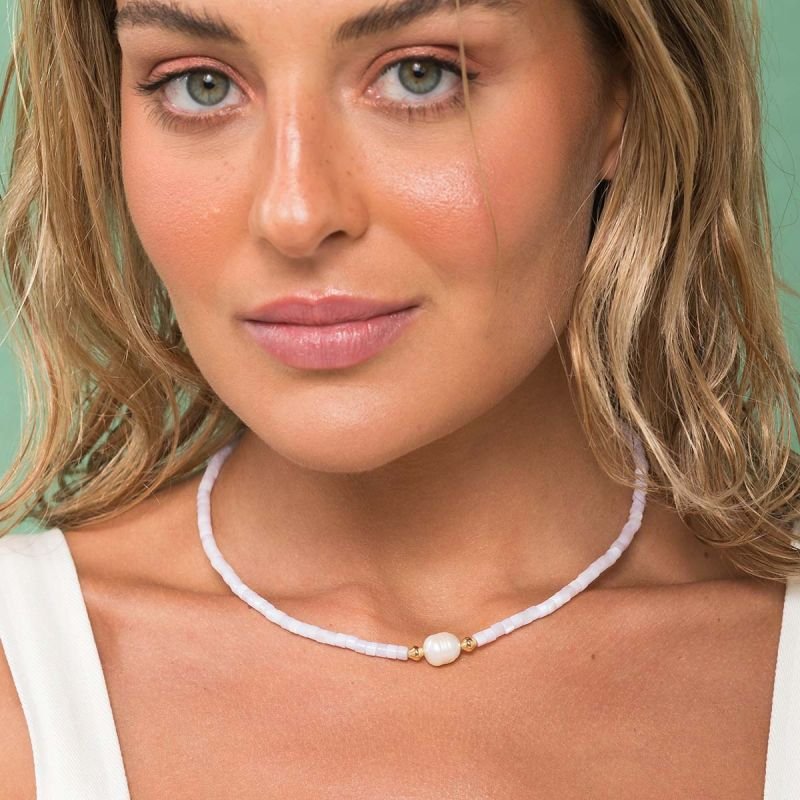 Um modelo delicado e cheio de poesia: colar feito em madrepérola, que traz um brilho suave e natural, combinado ao charme único da pérola de água doce — joia orgânica cultivada em rios e lagos, conhecida por sua forma irregular e brilho acetinado, que a tornam uma verdadeira preciosidade da natureza.