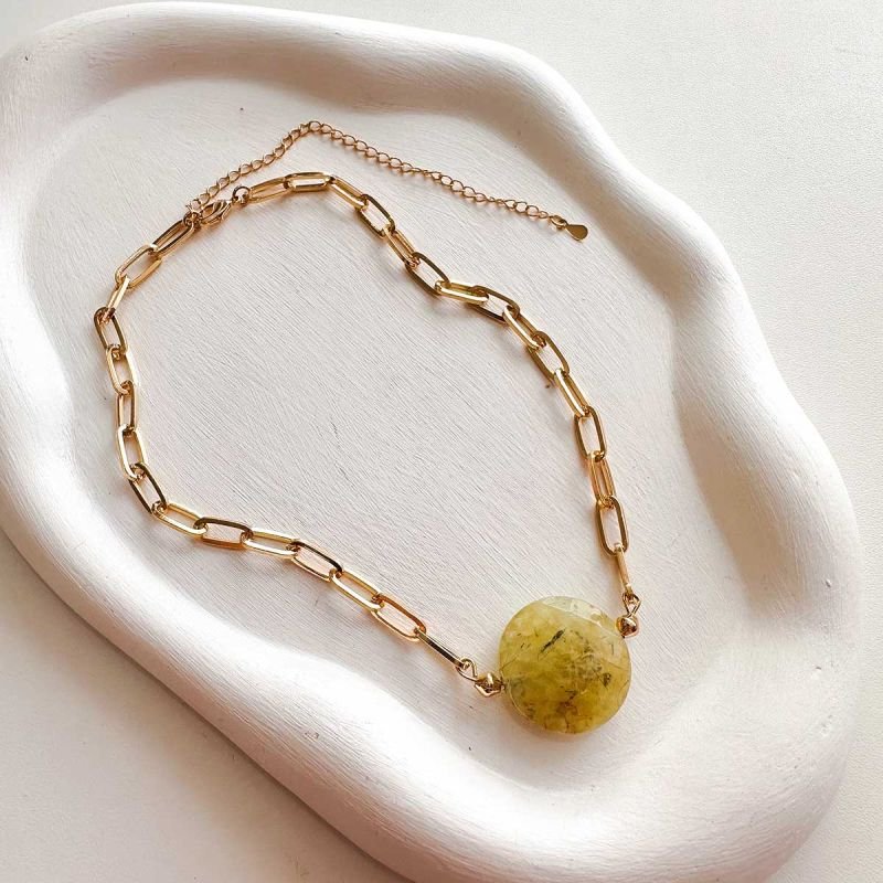 Este colar traz a força do design contemporâneo unida ao poder das pedras naturais. A corrente de maxi elos banhada a ouro 18k confere presença e sofisticação, enquanto o pingente central em rutilo verde é o grande destaque da peça, proporcionando personalidade e significado especial.