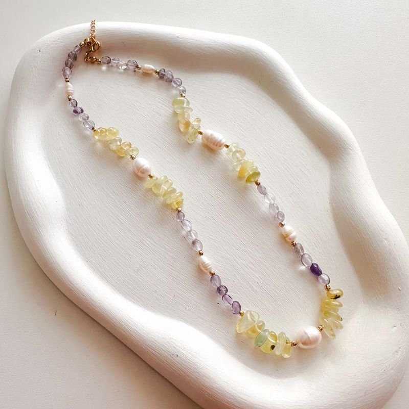 Este colar é uma peça encantadora que une o brilho natural das pedras ao charme atemporal das pérolas. Ele combina quartzo verde e ametista em diferentes formas e tonalidades, intercalados por pérolas de água doce e delicados metais banhados a ouro 18k, criando uma composição sofisticada e cheia de significado.