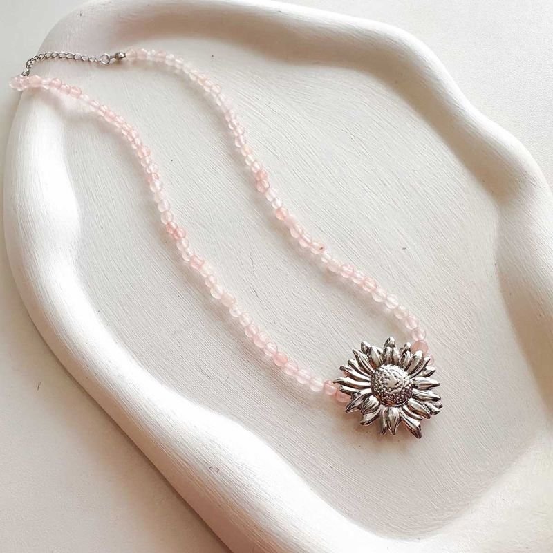 Um colar delicado e cheio de simbolismo, que une o romantismo do jade rosa com a energia vibrante do girassol. A peça apresenta uma sequência de pedras em tom suave, finalizada com um pingente de girassol banhado a ródio, trazendo brilho e sofisticação ao design.