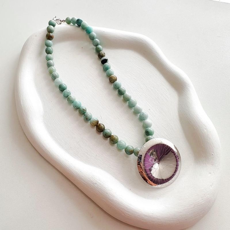 O contraste elegante surge com as contas de amazonita, pedra conhecida por transmitir calma, equilíbrio emocional e conexão com a natureza. O resultado é uma joia imponente, mas delicada, que transforma qualquer look com autenticidade.
