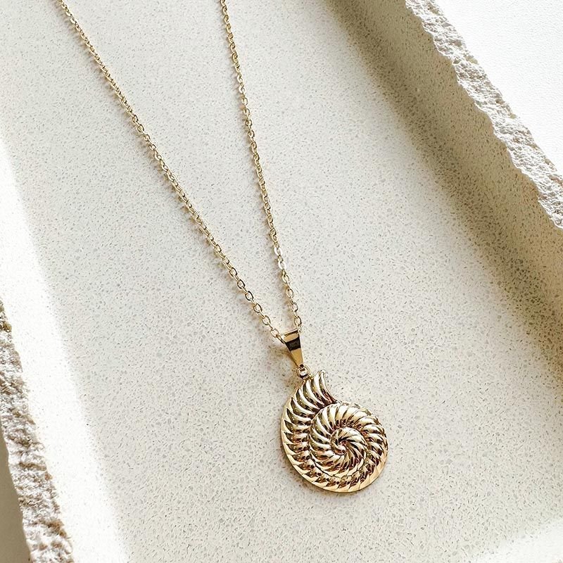 Com design escultural e inspiração marinha, o colar banhado com pingente de concha caracol traduz movimento, elegância e conexão com a natureza. Seu formato espiralado, com relevo marcante e acabamento polido, cria um efeito visual sofisticado que reflete a luz de forma delicada e envolvente.