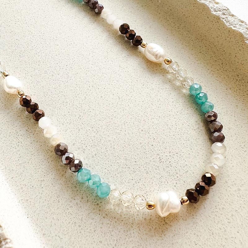 Elegante, delicado e cheio de nuances, o colar de cristais com pérola de água doce é uma joia que combina sofisticação natural e design contemporâneo. A composição harmoniosa de cristais facetados em tons neutros, terrosos e verde água cria um visual leve e refinado, enquanto as pérolas de água doce adicionam brilho suave e exclusividade à peça.