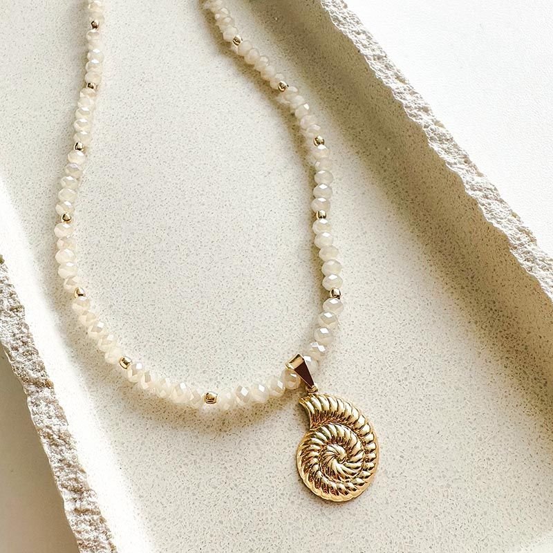 Elegante, luminoso e com forte inspiração natural, o colar de cristais com pingente de concha caracol é uma joia que traduz movimento, delicadeza e conexão com os ciclos da vida. Os cristais facetados em tom leitoso criam um brilho suave e sofisticado ao redor do pescoço, enquanto o pingente de concha caracol em acabamento polido se destaca como ponto central da peça, trazendo presença e significado.