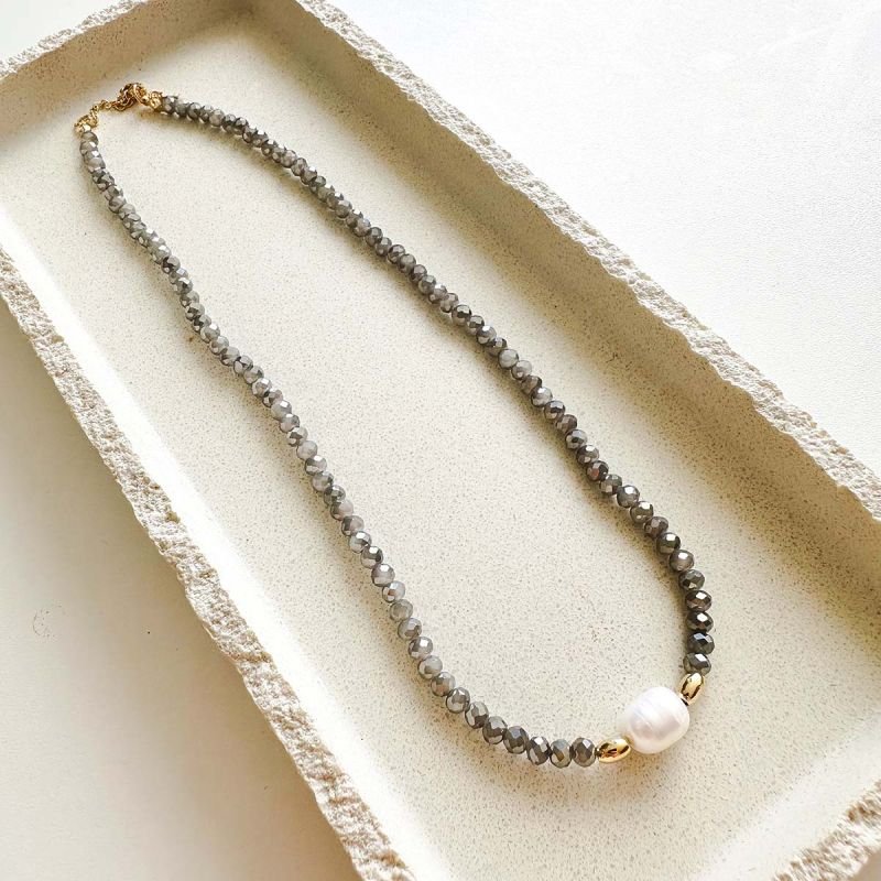 O colar de cristais na cor fendi é a tradução perfeita da elegância neutra e sofisticada. Com brilho delicado e tonalidade atemporal, ele combina cristais lapidados com uma pérola central orgânica, criando uma peça moderna, feminina e extremamente versátil.