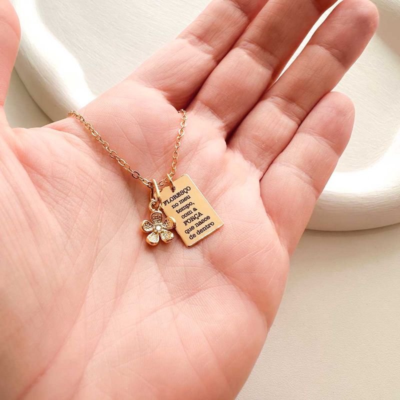 Um colar delicado que une romantismo e significado. A corrente fina sustenta dois pingentes: uma charmosa flor com detalhes brilhantes e uma plaquinha com inscrição especial, ambos banhados em ouro 18k e ródio, criando um contraste sofisticado entre os metais.