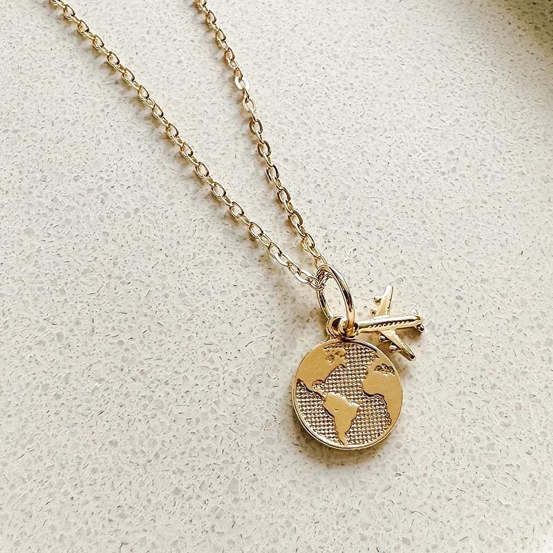 A medalha redonda possui textura delicada com continentes em alto-relevo, enquanto o avião traz leveza e um toque moderno à composição. Disponível nos banhos em ouro 18k ou ródio, é uma peça versátil, perfeita para uso diário ou para compor mix de colares com personalidade.