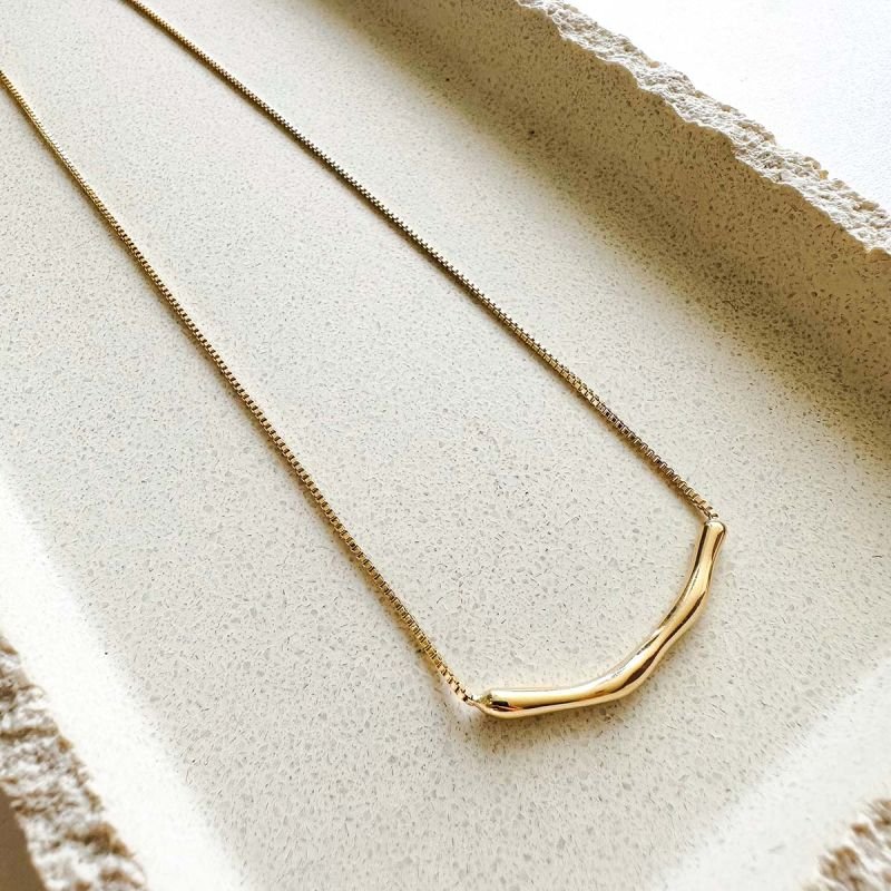 O Colar Barra Angular traz um design contemporâneo e sofisticado, com corrente delicada e detalhe frontal em formato levemente angulado, criando um traço moderno no colo.