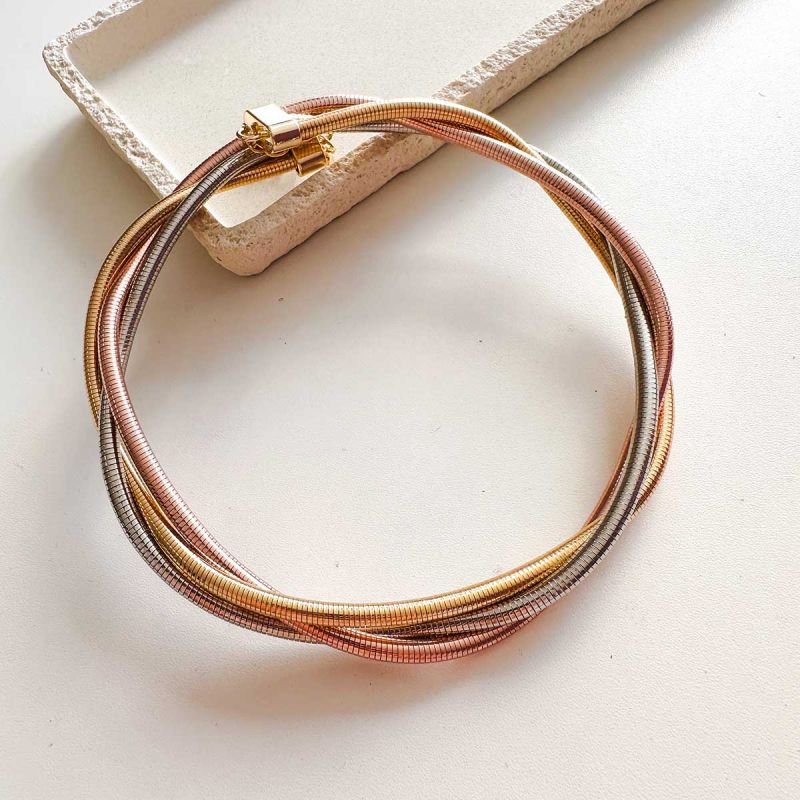 O Colar Biju Três Banhos Entrelaçado é a peça perfeita para quem deseja um acessório marcante, moderno e cheio de estilo. Feito com três fios metálicos rígidos entrelaçados, ele forma um desenho orgânico e elegante no colo, criando um visual contemporâneo que ilumina qualquer produção.