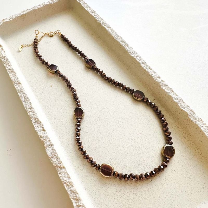 Esse colar combina cristais lapidados em tom chocolate metálico com detalhes em vidrinhos (vitral), criando um jogo de profundidade, transparência e brilho.