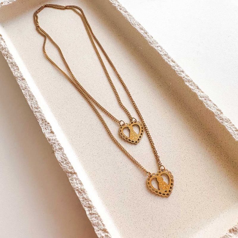 O Colar Escapulário de Aço Coração Nossa Senhora é uma peça delicada e simbólica, criada para quem deseja carregar amor, proteção e fé bem pertinho do coração. Com dois pingentes em formato de coração vazado e acabamento rendado, cada medalha traz a imagem de Nossa Senhora gravada com delicadeza e precisão, criando um escapulário moderno, feminino e cheio de significado.