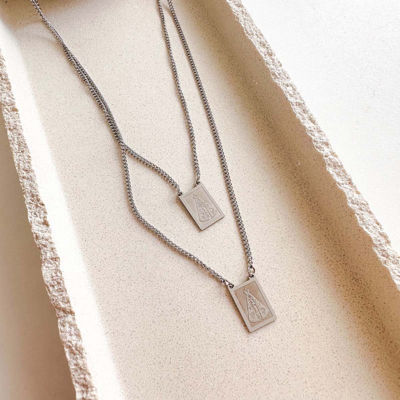 O Colar Escapulário de Aço Nossa Senhora é uma peça atemporal, simbólica e cheia de significado. Com duas medalhas retangulares finamente gravadas e corrente em aço inoxidável resistente, ele traz a força da fé e a delicadeza de um acessório moderno, perfeito para usar todos os dias.