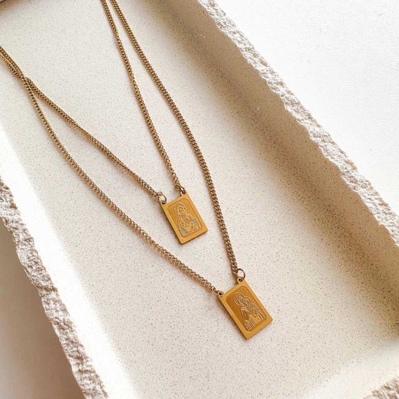 Fabricado em aço inoxidável dourado, o escapulário une tradição e modernidade em um design leve, elegante e perfeito para uso diário.