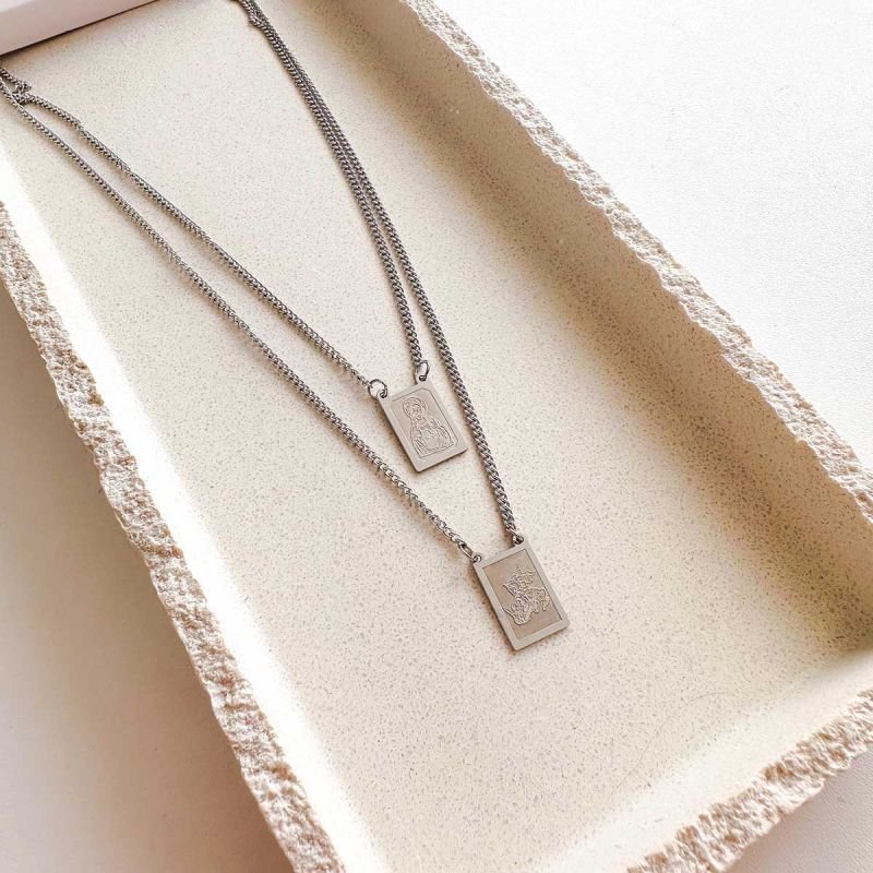 O Colar Escapulário de Aço São Jorge é mais do que um acessório: é um símbolo de força, proteção e coragem para carregar todos os dias. Com duas medalhas retangulares gravadas em alta precisão — uma com a imagem de São Jorge e outra com a Sagrada Família — este escapulário traz consigo um significado profundo e uma presença espiritual constante.