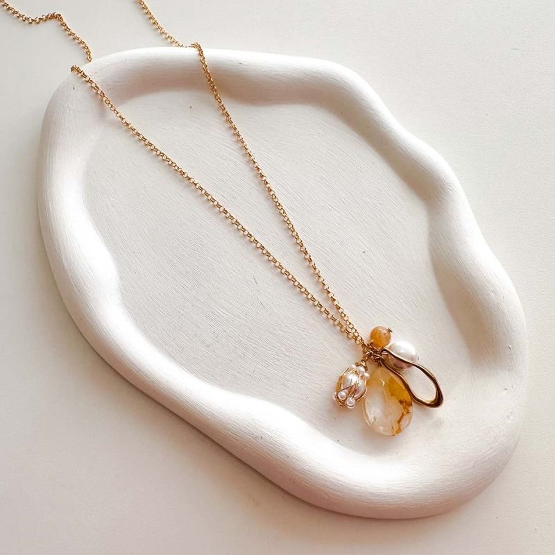 Um colar criado para irradiar luz, abundância e significado. O design delicado da corrente longa banhada a ouro 18k ganha destaque com seus badulaques pendentes, que unem a força do citrino à pureza da pérola, além de detalhes elegantes em metal. Uma joia que vai além da beleza, trazendo simbolismos poderosos para o dia a dia.