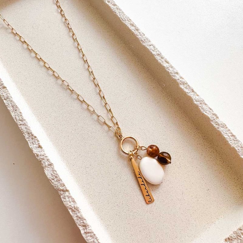 Pingentes: pérola shell, contas terrosas e plaquinha escrita “liberdade”