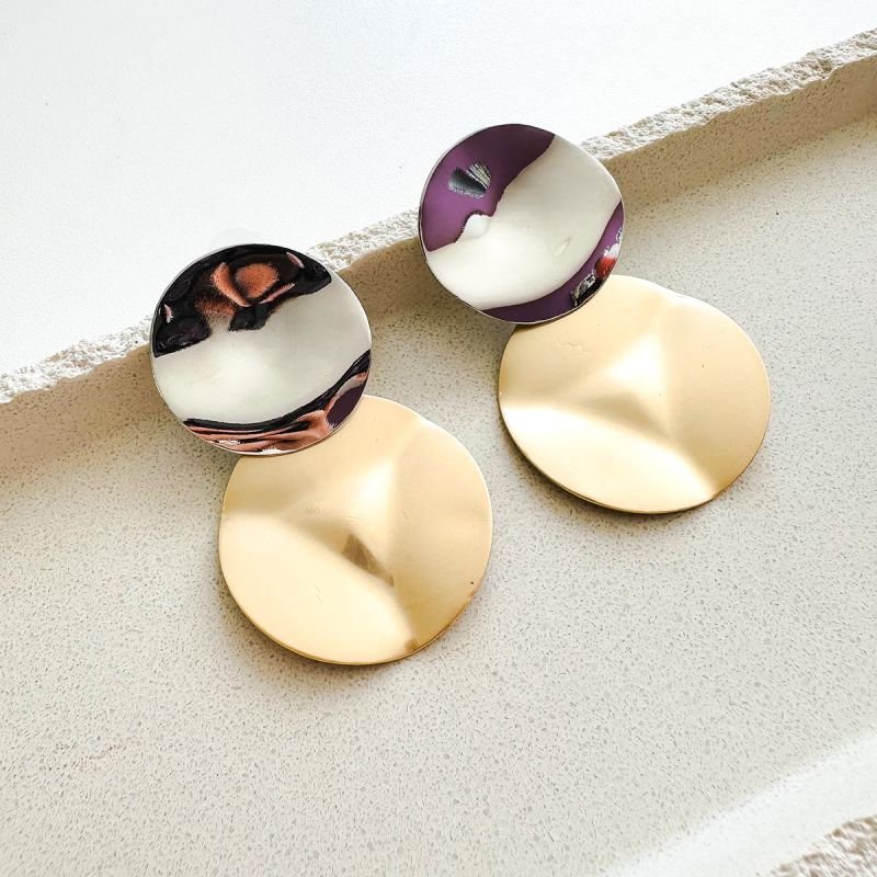 Com design marcante em dois discos sobrepostos, esse maxi brinco combina contraste de texturas: parte superior com acabamento polido espelhado e base com efeito levemente acetinado e abaulado no centro.