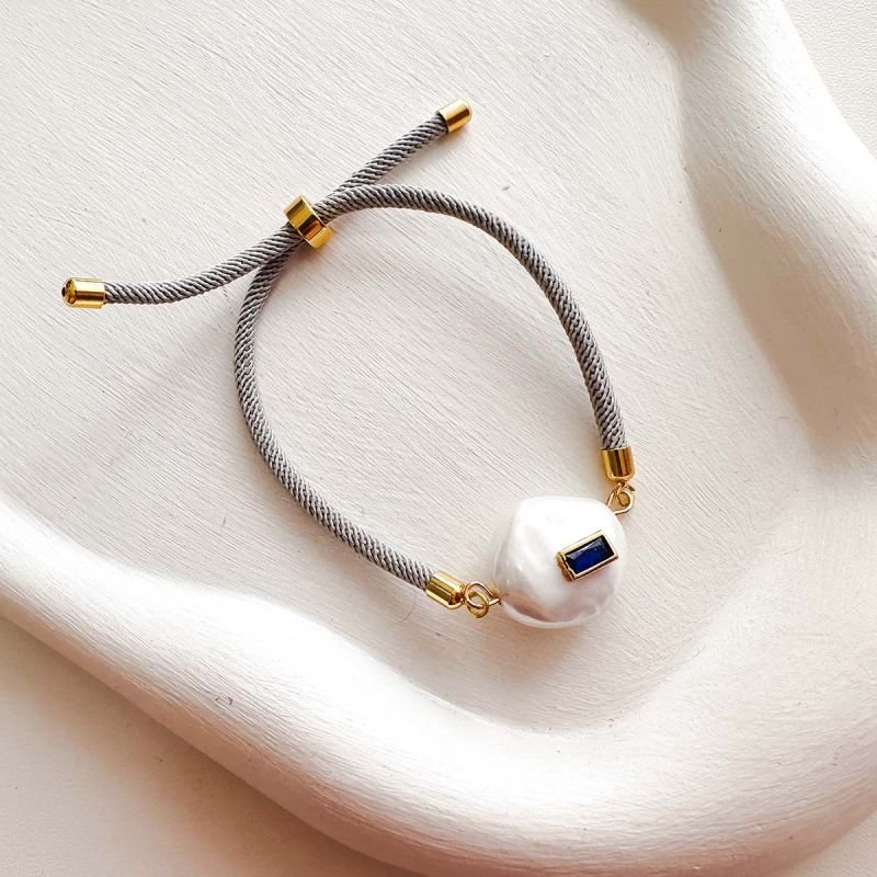 Pulseira Corda Slide Cinza com Pérola Shell e Cristal Azul