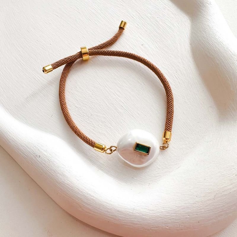 Delicada, sofisticada e cheia de significado. Essa pulseira une a modernidade do cordão ajustável em tom terroso com a elegância atemporal da pérola shell, destacada por um detalhe de cristal verde em lapidação retangular, cravejado em aro dourado. Uma peça que equilibra naturalidade e sofisticação, perfeita para compor diferentes estilos.