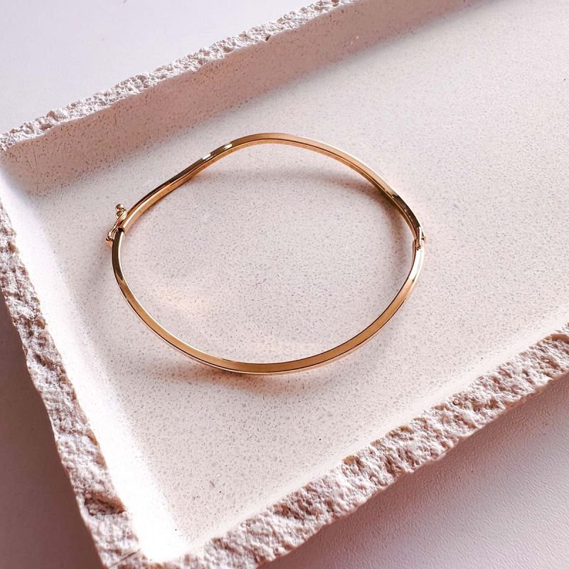 A Pulseira Escrava Ondulada é a definição de elegância minimalista. Seu design rígido, porém delicadamente curvado, cria um movimento orgânico que reflete a luz de forma sofisticada, destacando o pulso com um brilho limpo, moderno e extremamente estiloso.